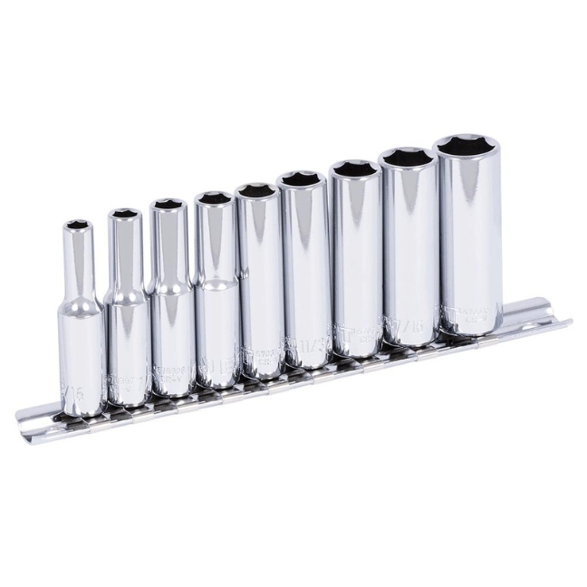 The Jet 601107 SS1409D-6 1/4″ Drive 6 Point Deep SAE Socket Set 9-Piece includes: