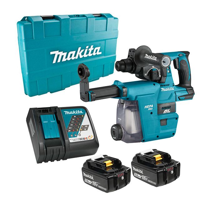 The Makita DHR242RTEW 18V LXT 15/16″ Brushless Rotary Hammer with Dust Extractor Kit includes: