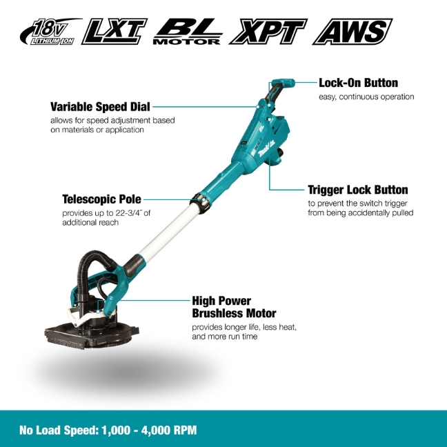 Makita DSL800Z 18V LXT BL Brushless 1,000 to 4,000 RPM Drywall Pole Sander with AWS – Tool Only