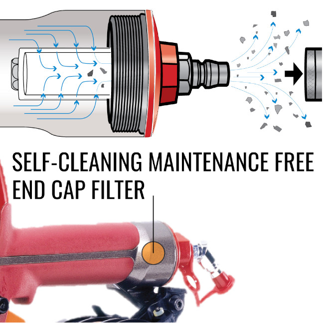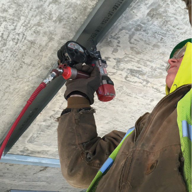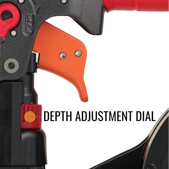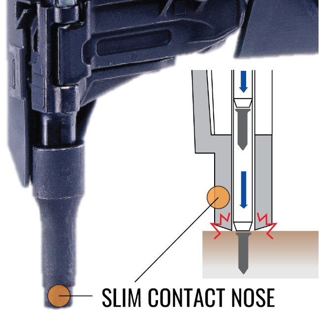 - Slim contact nose helps to consistently drive pins when fastening metal studs