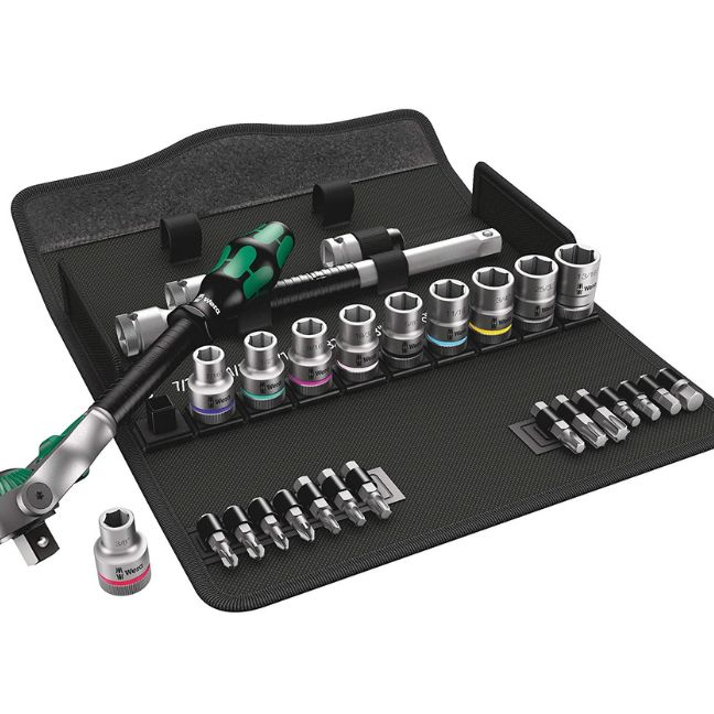The Wera 004079 8100 SC 9 Zyklop Speed Ratchet Set 1/2″ Drive SAE/Imperial 28-Piece includes:
